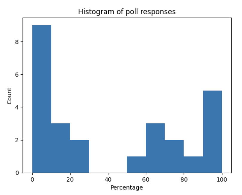 But anyway, people absolutely do not agree on this. Look at this crazy bimodal distribution. The most popular single percentage, with 6 out of 29 votes, was 5%, followed by 60% (3/29) and 90% (3/29). No one picked 35%, 40%, 45%, or 50%, the three answers closest to the final average.
