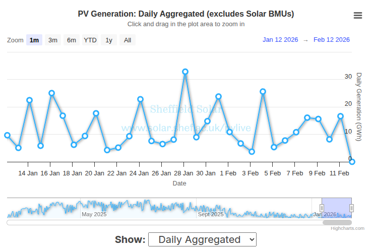 Will the UK produce more solar energy on Thursday (Feb 12) than it did on Wednesday (Feb 11)?