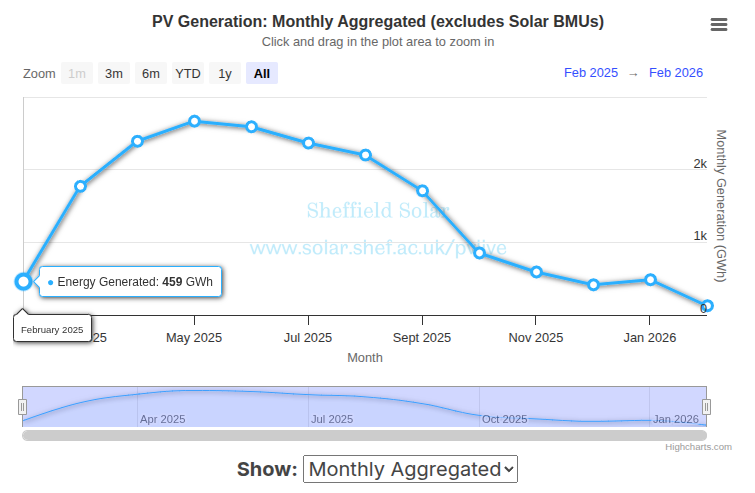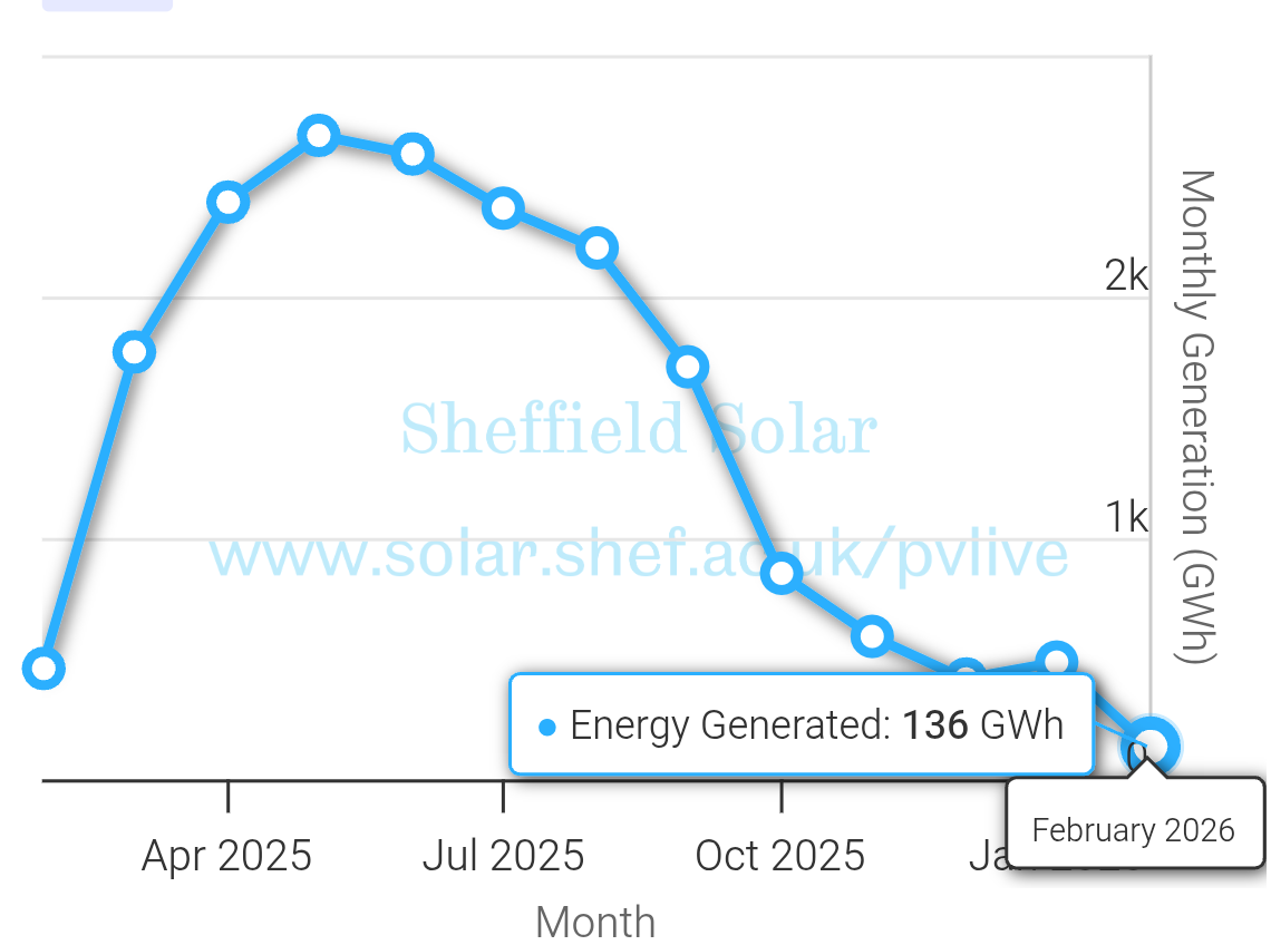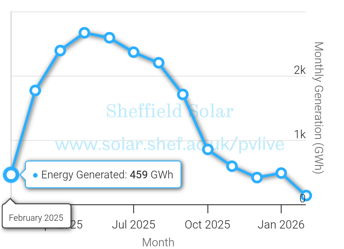 Update 2026-02-12 (PST) (AI summary of creator comment): The creator has clarified that resolution will be based on the "Monthly Aggregated" view on the graph at https://www.solar.sheffield.ac.uk/pvlive/, rather than by downloading and manually summing historical data.