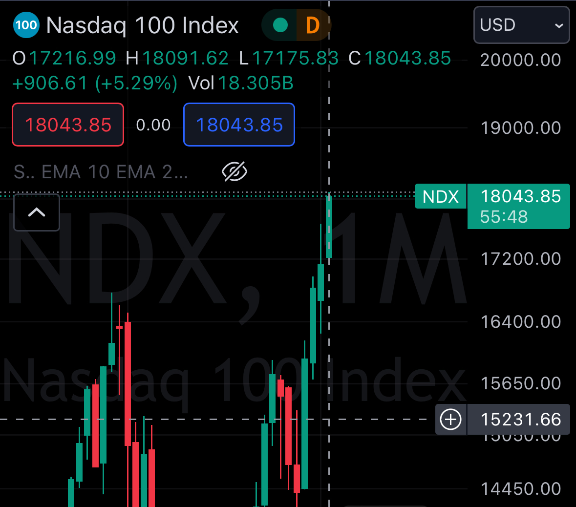 Resolves yes if the closing price of the monthly candle of the NDX is greater than the opening price. (17216.99)