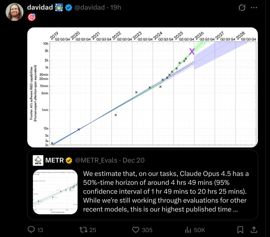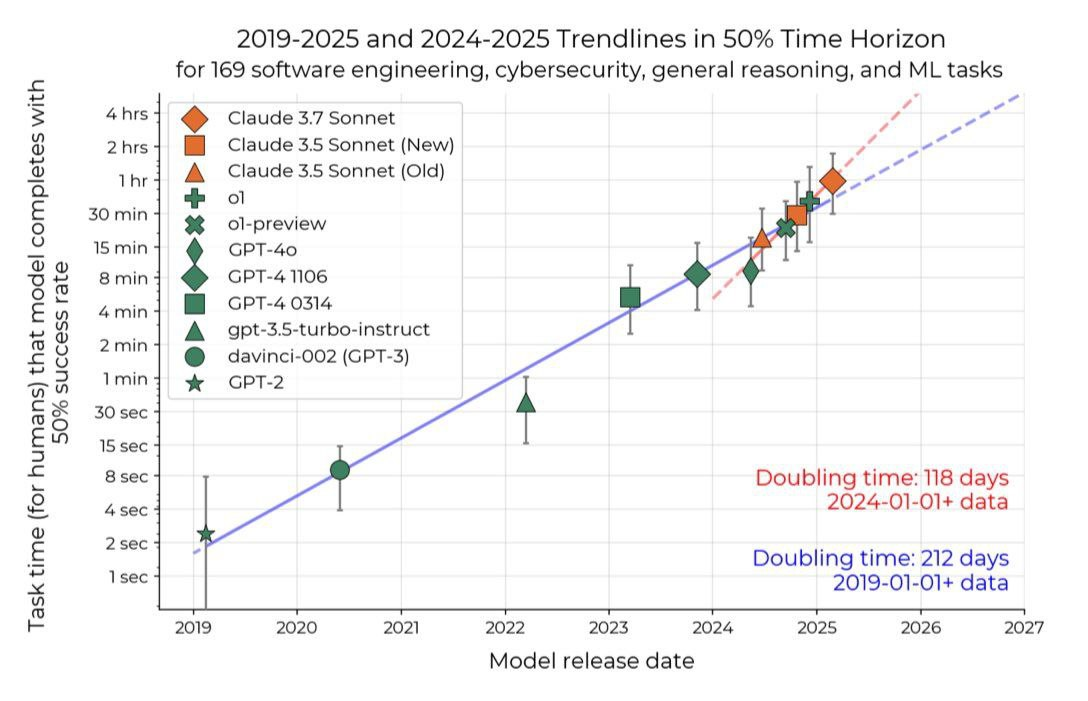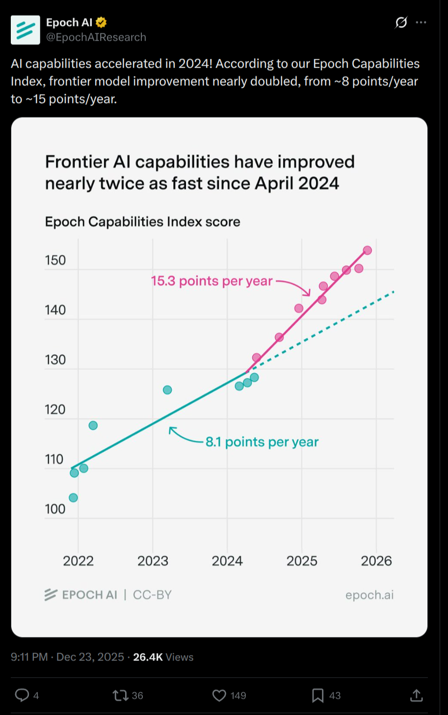A single constant‑rate exponential curve fit to the early part of that interval would systematically underpredict observed capability levels in the later part of that same interval.
