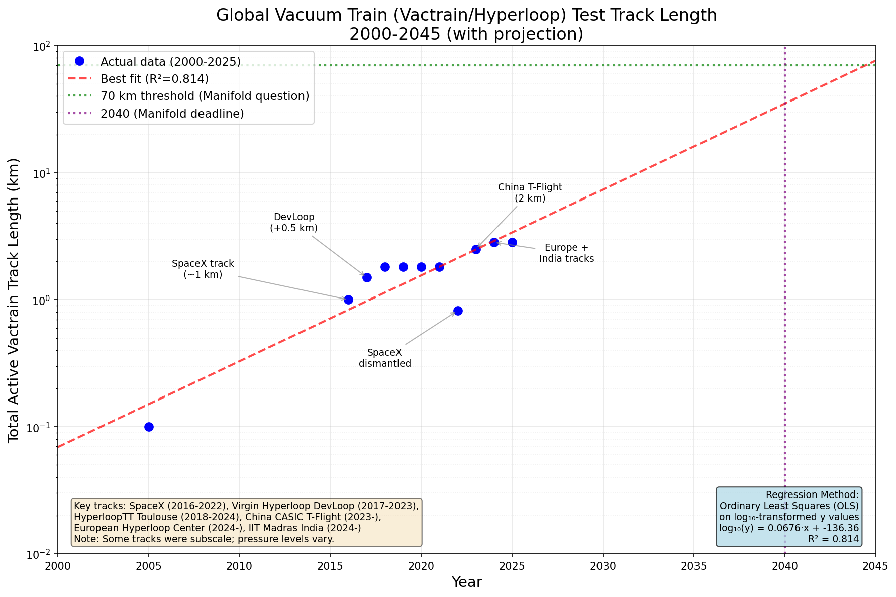 Resolves as YES if there is strong evidence that, at any time before January 1st 2040, the total length of active vactrain lines worldwide reached at least 70 route‑kilometers, under the definitions and criteria below.