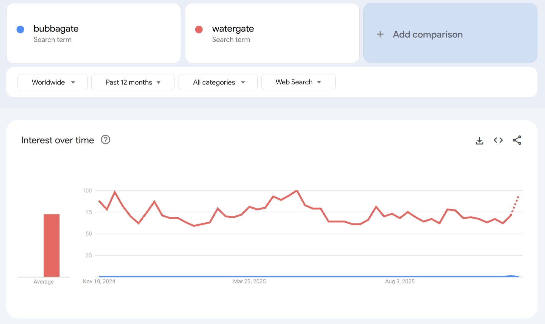 Resolves as YES if there is strong evidence that the average worldwide Google Trends metric for the term 'bubbagate' exceeds that of 'watergate' between Jan 1st 2025 and Dec 31 2025.