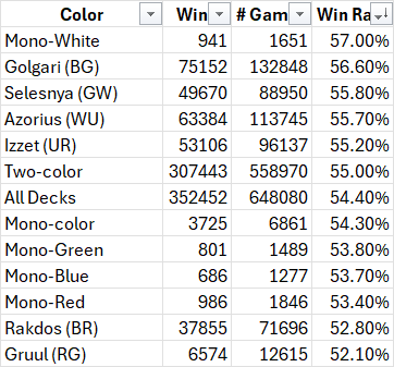 At time of market creation the highest ranked is mono-White at 57.0%, followed by Golgari at 56.6%.