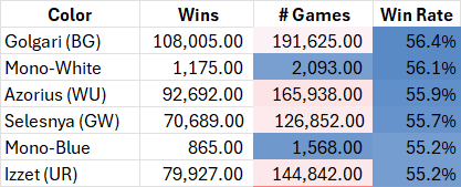 As the no of games played for the mono-colors is significantly lower I can see a case for not including them in the comparison or making the cutoff higher. Welcome people's thoughts.