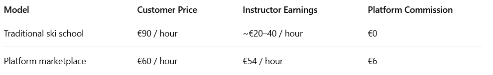This structure strongly favors incumbent ski schools. However, it simultaneously creates an opportunity for a platform-based substitute that reconfigures market access, pricing, and value capture without directly competing as a traditional ski school.