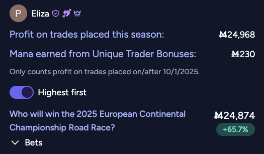 You or anyone won't like to hear it but, of course, if you filtered bets based on fills you could allow only profits on your own markets that were directly filled by another user. So if you place maker orders and someone else fills them, those count for leagues. If you fill someone else's order, that counts. If you bet against your own AMM or your own limit order, it doesn't count. You no longer need a 1 hour cooldown.