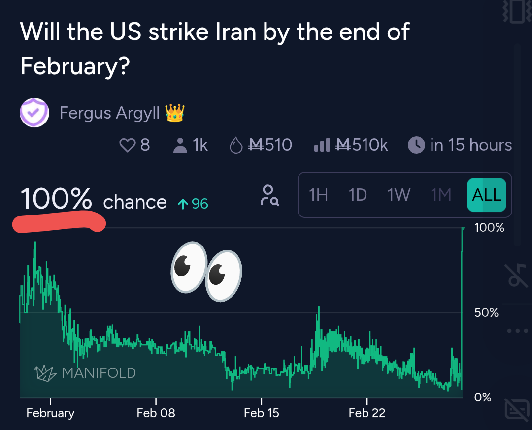 @TheAllMemeingEye yet again, Manifold is great at predicting things as long as the market remains open after the event has occurred in the real world so everyone can trade after the fact!