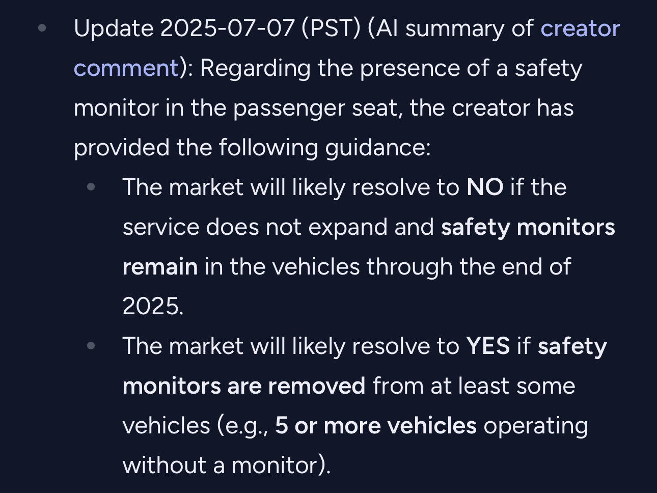 PS: Just to clarify, I think arguing that passenger-seat monitors shouldn't count as supervision is a totally non-crazy case to make. There's a healthy debate to be had there. I just want to defend the market creator against any implication that he would be contradicting himself by deeming passenger-seat monitoring to fall short of "fully autonomous".