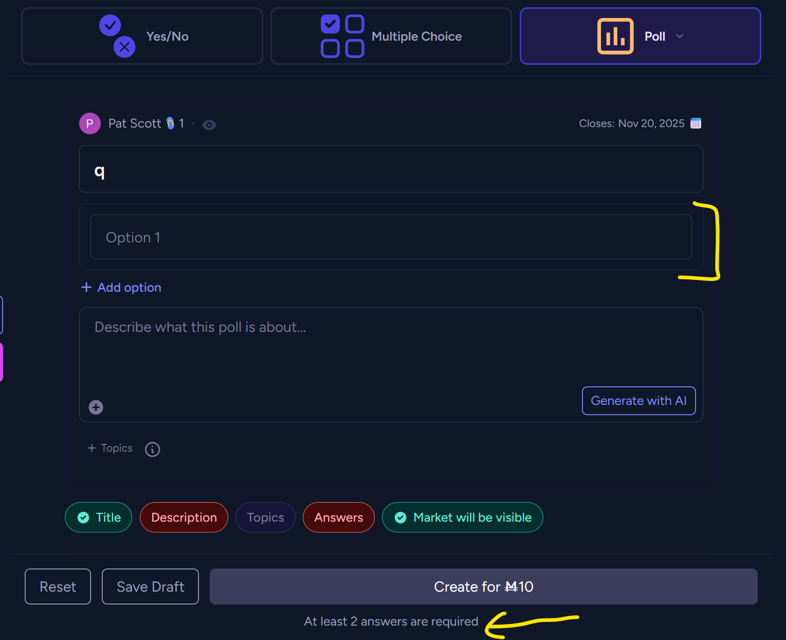 - Made 2 answers non-deletable instead of 1 for MC markets