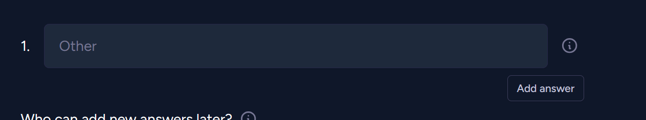 @Gen alright I finally went and look at how MCs are done currently, for parity's sake. It looks like anything that allows user-submitted answers (creator-only or anyone) allows for starting with only 1 answer, and only requires 2 if there's no opportunity for adding answers. "Other" always counts as one answer, so in the current UI it's possible to create dependent MCs with only Other.