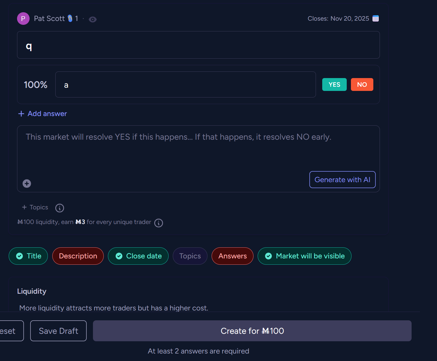 After some more changes to simplify it - I again invite you all to try the updated new /create UI on dev, I will reward any bugfinds with smaller amounts (e.g. M1k) and anything major that resolves this market still has an M5k bounty (it may already be claimed, yet to be judged).