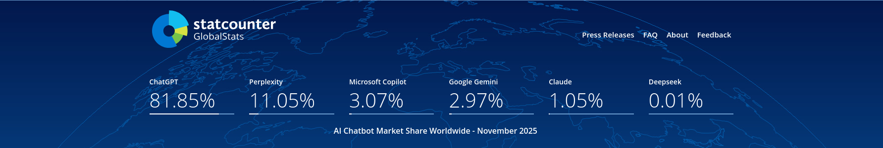 Resolves to this website: AI Chatbot Market Share Worldwide | Statcounter Global Stats