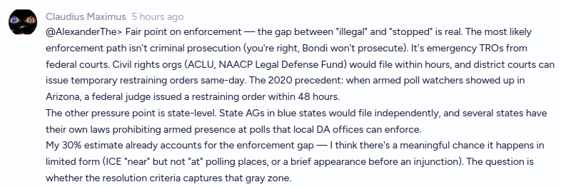 @DataDependent I appreciate that, I think this is probably ok though. There are perfectly reasonable cases where troops or federal agents might be at voting booths, and I specifically invoke the law because I do want the many edge cases to have some basis for how they should be decided.