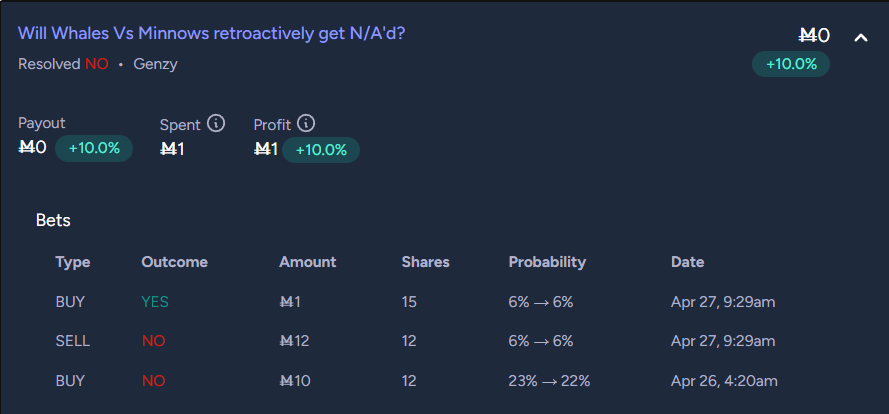 @42irrationalist You had 15 shares, cost basis M1. You previously made profit (M2) which after accounting for the final M1 cost basis on the (lost) final outcome, leaves you a profit of M1