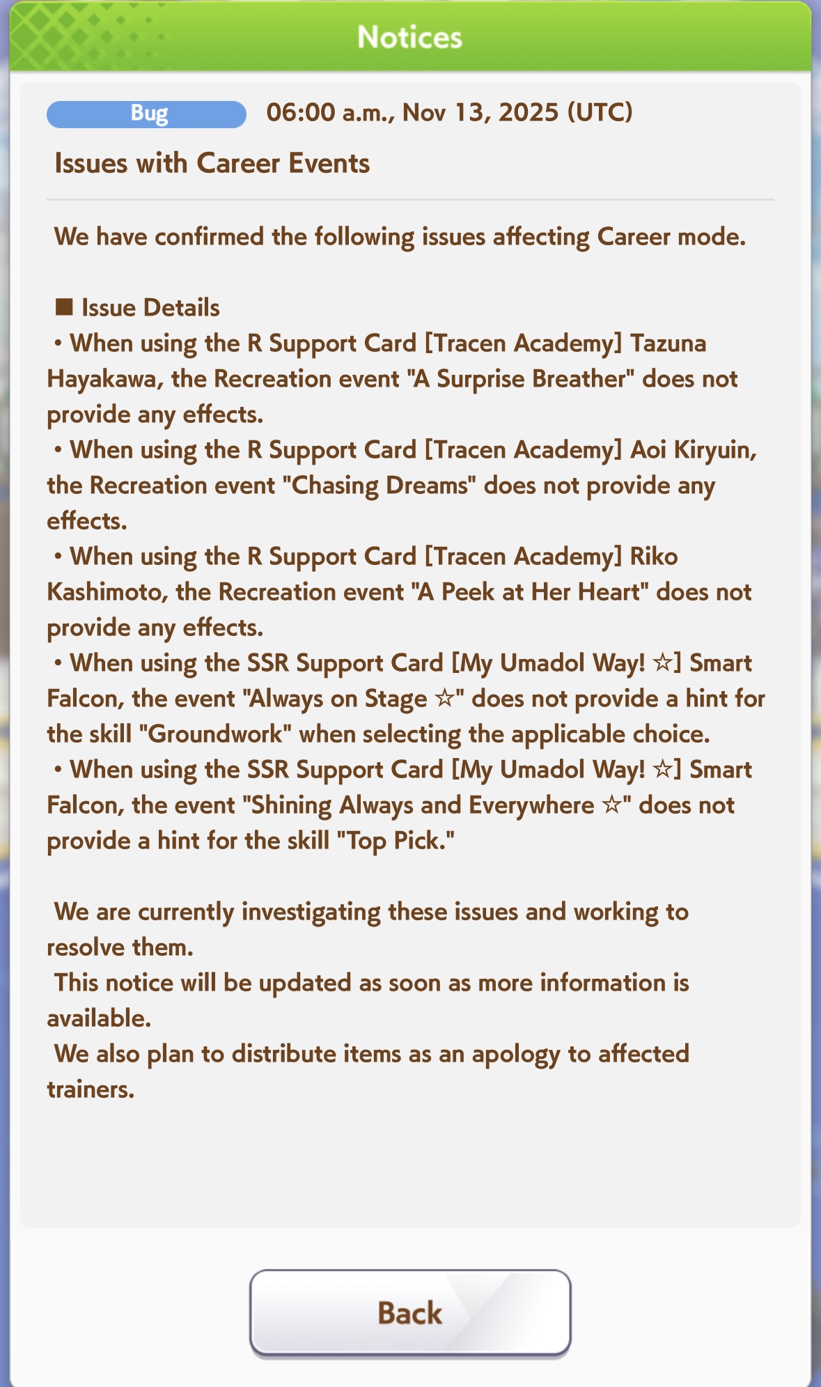 Cygames pushed a major new update to Umamusume global today. It has also introduced quite a few bugs (character events not working, distorted audio, missing card updates, game crashes, etc.). So far there has been radio silence from Cygames, who has not yet acknowledged that anything is broken.