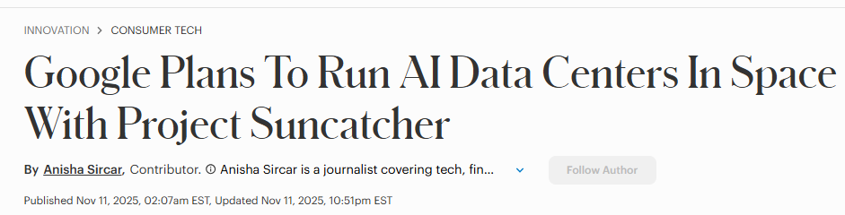 @MiguelLM a lot of these don’t count as data centres though. Tomorrow.io for example is data collection for earth based data centres. Project suncatcher does seem like it could lead to one, but reading the google article they have on it is more like “we will collect energy in space …. AI!!”. That is to say their actual goal is practical R&D and all ai mentions are to hype investors, but I can see how Forbes would jump on the hype train like that.