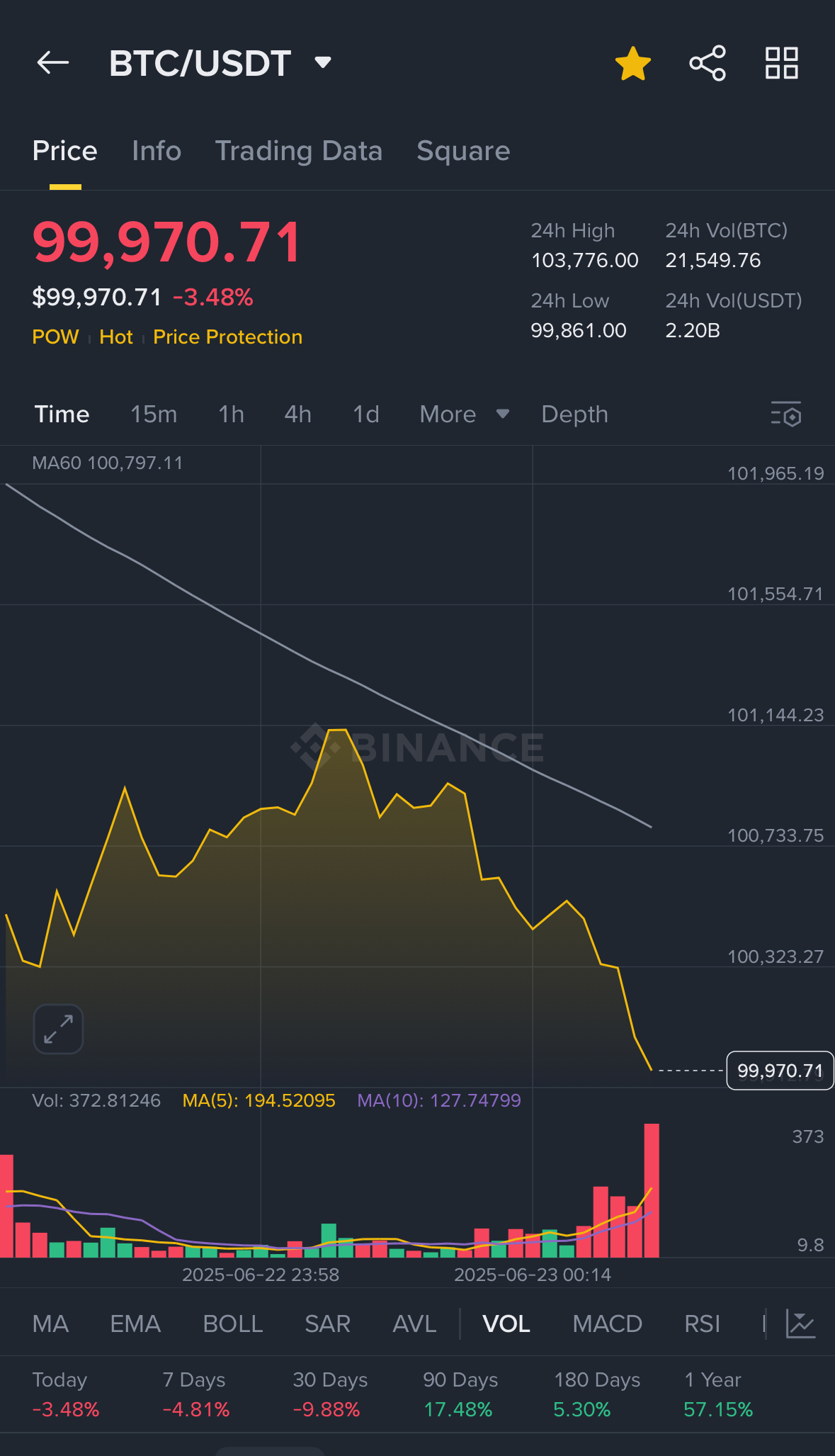 Resolves YES if and only if the low price on any one-minute candle in Binance’s BTC-USDT market equals $99,999.99 USDT or lower after market creation and on or before June 30th, 11:59pm ET.