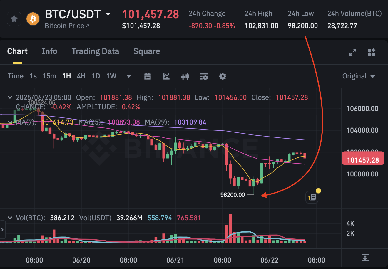 @PGdCIN9 that candle is the week beginning june 22nd, the previous week’s low is below 100k. you can see the 24h low is 98.2k