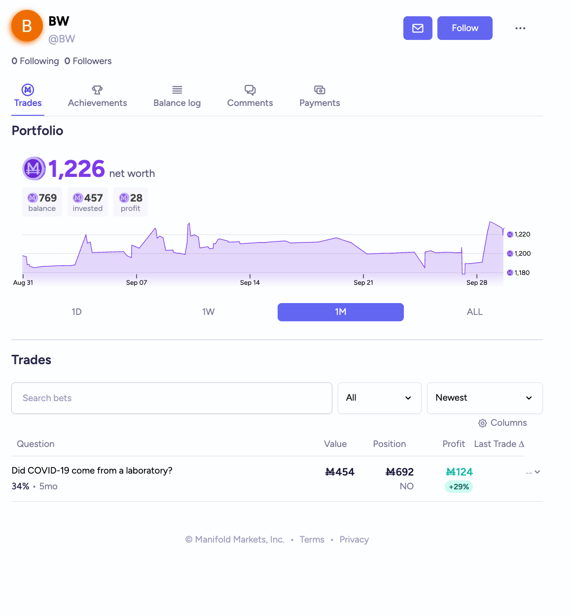 However, I think most Manifold whales realized that one user on this market was willing to spend upwards of a million mana on a market that was unlikely to ever resolve, consistently on a month-by-month basis to earn league profits. So, they wisely did not put any mana into this market. If there was an equally zealous lab-leak believer on Manifold who also had millions of mana at their disposal, I think the market would have reached an equilibrium closer to 67%, where it sat just over a year ago.