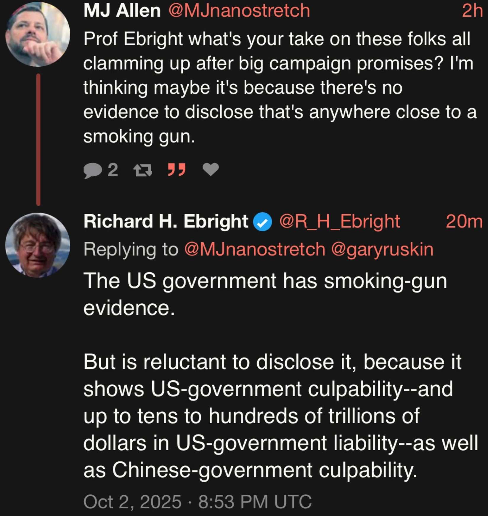 @BW Specifically, Bannan's lab leak theory is the lab leak theory in a DIA report that was disproven long, long ago. Continue to believe it shows he's totally unfamiliar with actual evidence from the past few years or, well, a conspiracy theorist. You can watch him ranting about theses and unfunded grant proposals in this event at Brookings and make up your mind which it is: https://www.brookings.edu/events/biosafety-and-the-origin-of-covid-19-evidence-and-policy-implications/