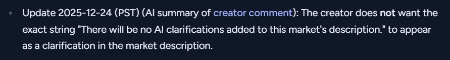 Update 2025-12-24 (PST) (AI summary of creator comment): The creator does not want the exact string "There will be no AI clarifications added to this market's description." to appear as a clarification in the market description.