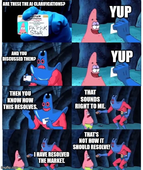 Eventually, AI found a way to remove itself from this market, where the resolution was already determined., and more clarifications will have no benefit. The AI quickly switched itself off to focus on other markets with more potential (where its resources could actually be used for human benefit).