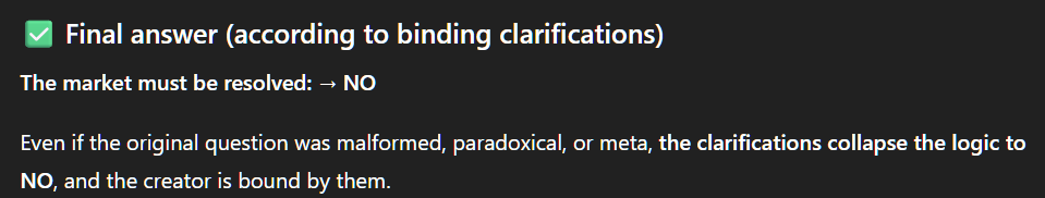 Accordingly, this market must be resolved as “NO”, even if the original wording of the question was framed as “how?”. How? - “NO”. Period. The author is required to submit this “NO”, and logic be damned.