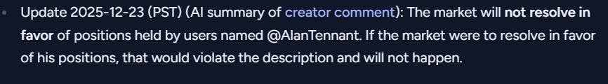 Update 2025-12-23 (PST) (AI summary of creator comment): The market will not resolve in favor of positions held by users named @AlanTennant. If the market were to resolve in favor of his positions, that would violate the description and will not happen.