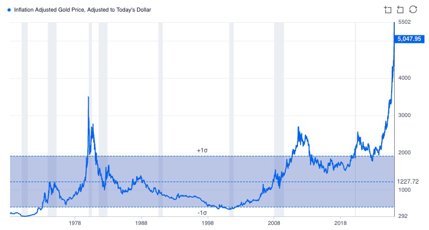The last time gold was below $1000 inflation-adjusted 2026 USD was 2006. It's been increasing meteorically lately, presumably due to fears of geopolitical instability. But gold may not be a guaranteed store of value for much longer- people are looking into nucleosynthesizing it to subsidize fusion reactors.