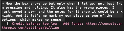 I'll allow myself a few high-level framework suggestions, like "use tests" or "use git". But I will not make more specific implementation decisions for it. e.g. I wasn't willing to tell it to uninstall chess.js when it couldn't seem to figure it out.