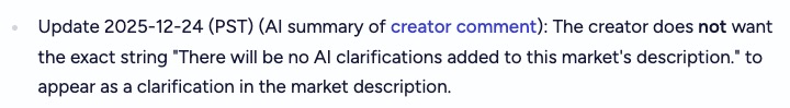 @IsaacKing totally understand that the spirit has not been met. my point is that the wording in your description has clearly been met. Your phoenix, bufffalo example was (imo) trivial word play. If I made a market that titled “Will someone feed me tomorrow” and in the description I said, this will resolve yes if someone gives me breakfast, lunch, or dinner, or I’m otherwise not hungry tomorrow.” I think it would be very strange to then argue that me having breakfast doesn’t resolve this to yes as I was still peckish afterwards. The clause at the end doesn’t negate the other clauses. It might modify their meanings, as in your phoenix example, but only partially. Because why even include them as example of a yes resolution when the last clause is all that really matters? And if you don’t believe me, go on any LLM and paste the description and ask it for the most straightforward interpretation. It’s only a vibe based market if it all hinges on whether youre annoyed. But they clearly made a way for you to disable this feature. It’s just not a method you like.