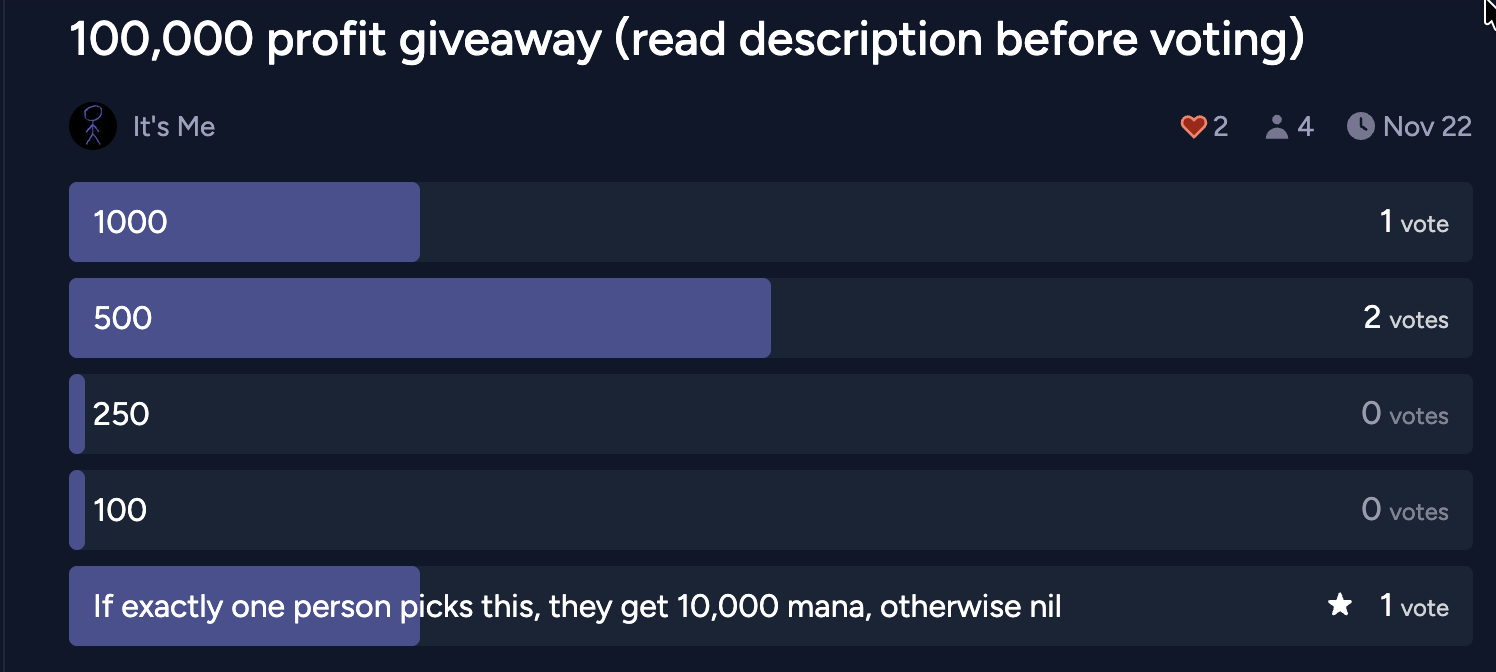 I am giving away some mana in celebration of 100,000 profit. For each option, the listed amount of mana is split amongst the people who choose it. Pick wisely!