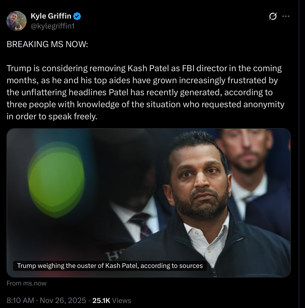 Kash Patel became the ninth Director of the FBI on February 20, 2025. This market resolves YES if Patel is no longer serving as FBI Director before December 31, 2026. This includes resignation, removal, or any other departure from the position. Resolution will be determined by official FBI leadership announcements or credible news reporting of his departure. The market resolves NO if Patel remains FBI Director through December 31, 2026.