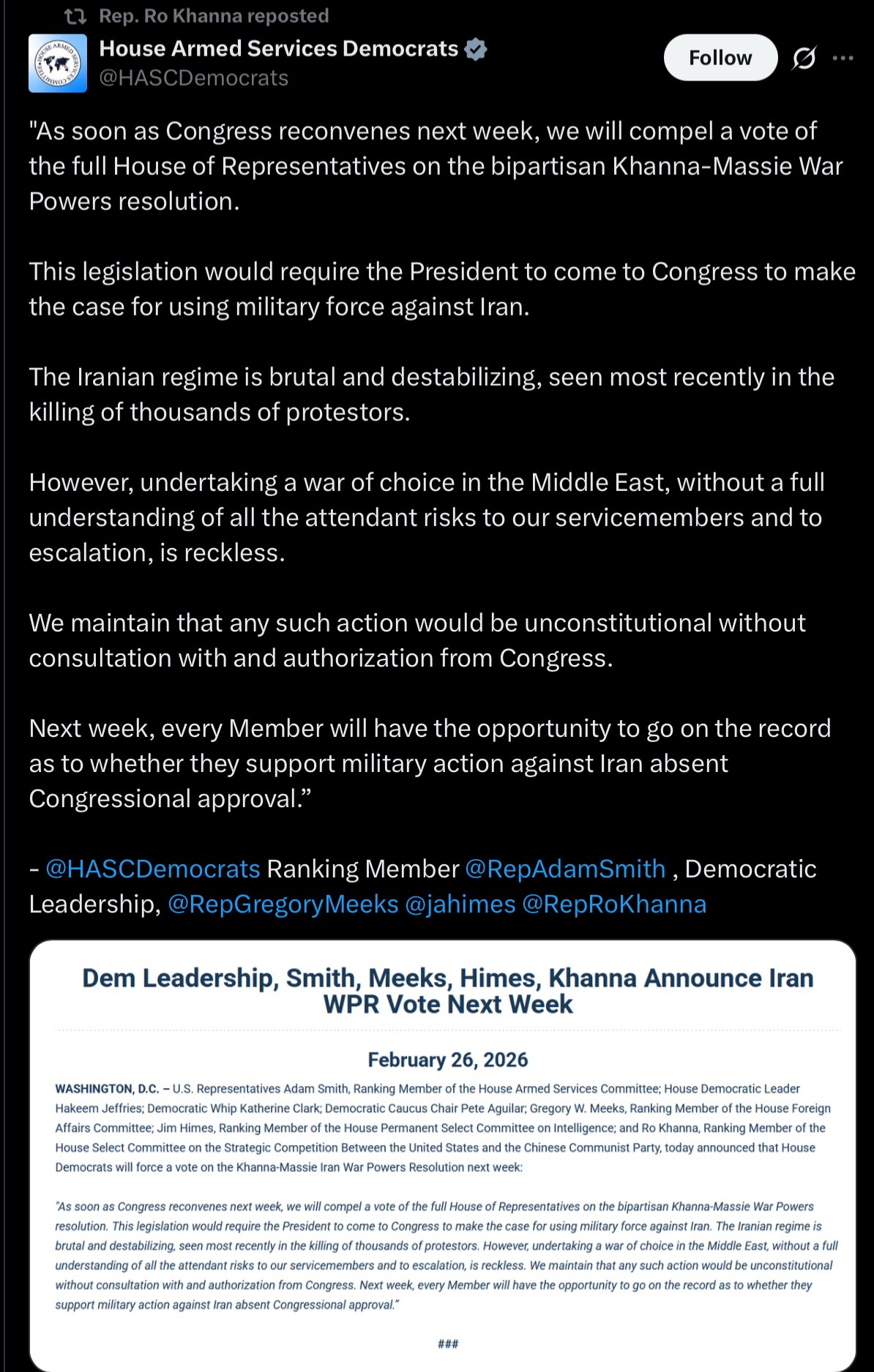 This is for the vote on Khanna Massie bill. Any other war power resolution doesn’t count.