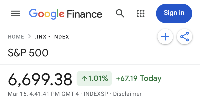 Resolves according to Google finance, S&P 500 CLOSING PRICE on March 16.