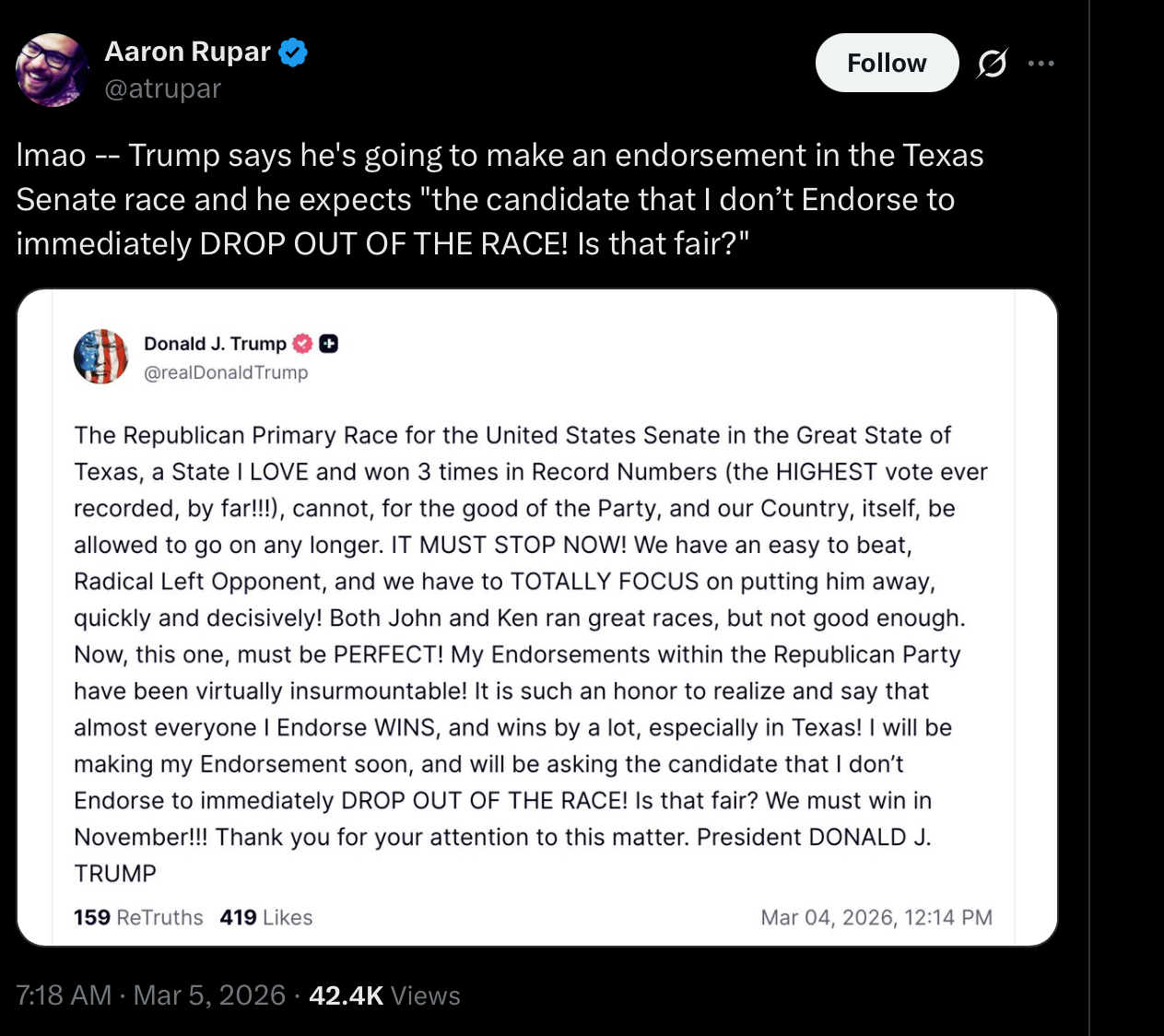 Resolves YES if Ken Paxton suspends his campaign, endorses cornyn or states that he will no longer campaign/try win votes.