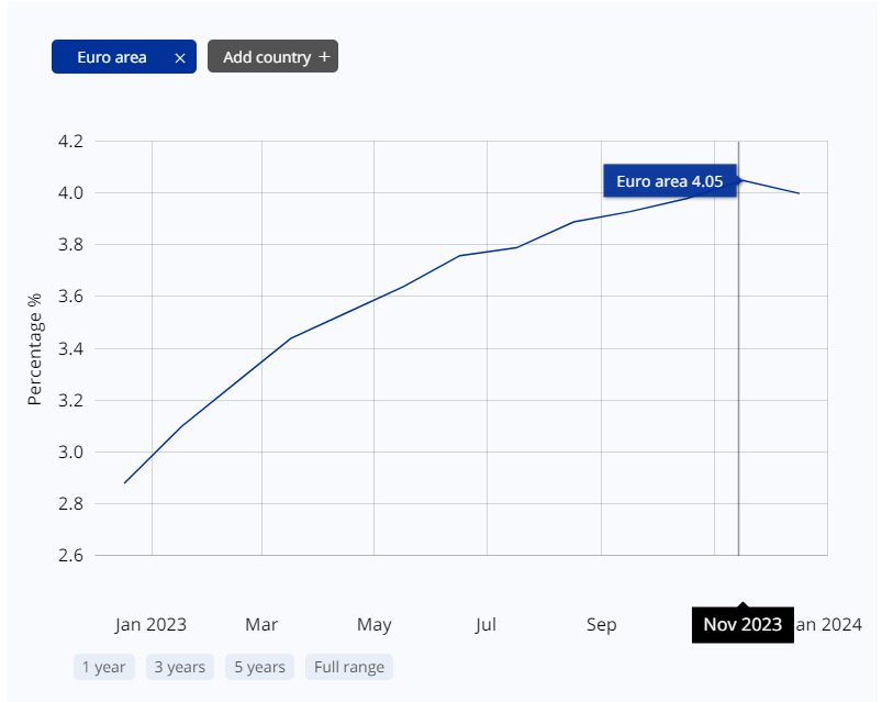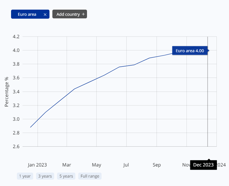 Since the start of 2023 the interest rate of Loans for house purchase (x > 10Y) seems to be sharply rising. How high will it go? The answer resolves to the interval containing the highest interest rate reached this year (NOT the rate at the end of the year). The lower bound of each interval is inclusive, the high bound is exclusive - that is if the highest peak is precisely 4.0 % the winning interval is 4.0 - 4.5 %.