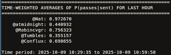 @121 I've fixed the code. I did notice this oddity when testing but I didn't properly think it through until I saw your comment, so thanks for pointing it out! It hasn't changed who the mana should've been sent to, but the result is much closer as expected. Manifold is being a bit weird and not letting me paste in images but the final fixed average conditional probs for Nat and Robin respectively were 93% and 87% (rounded to nearest %).