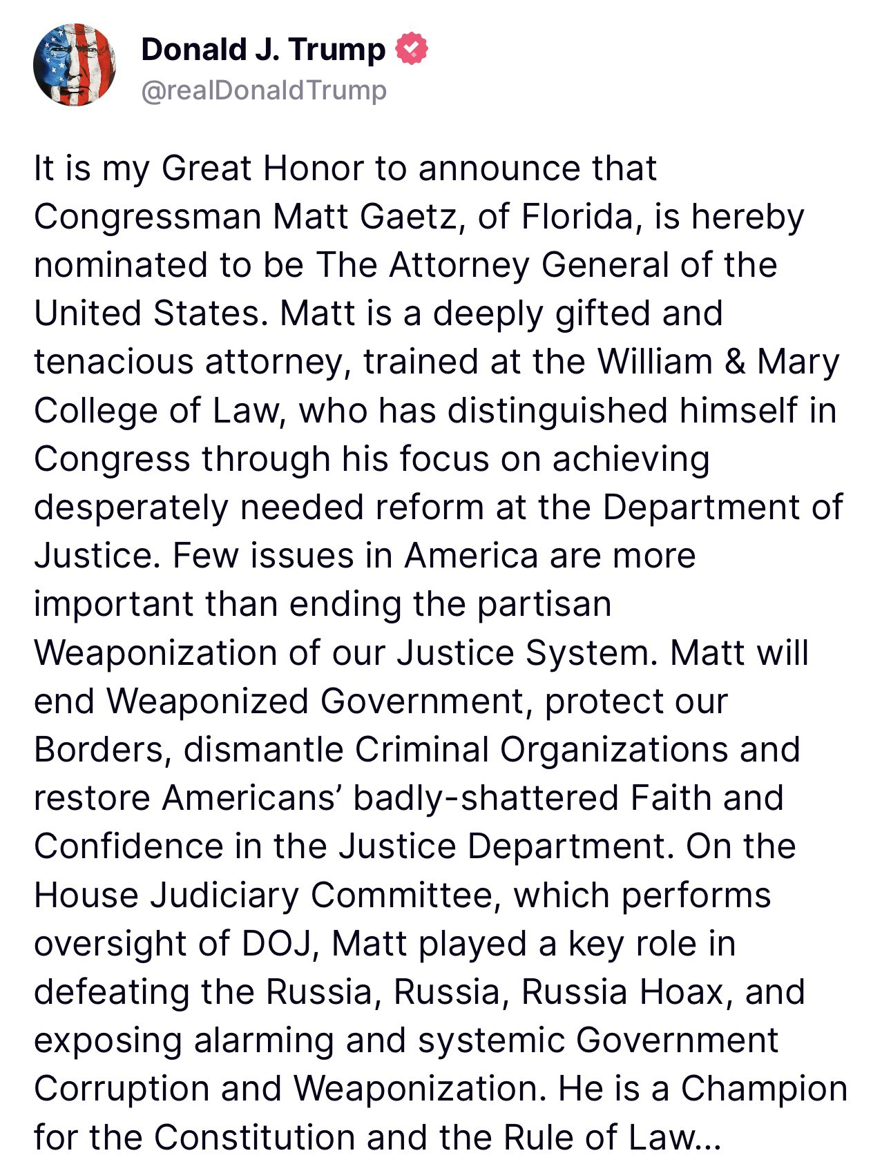"Trump announced his intention to nominate Gaetz as attorney general"