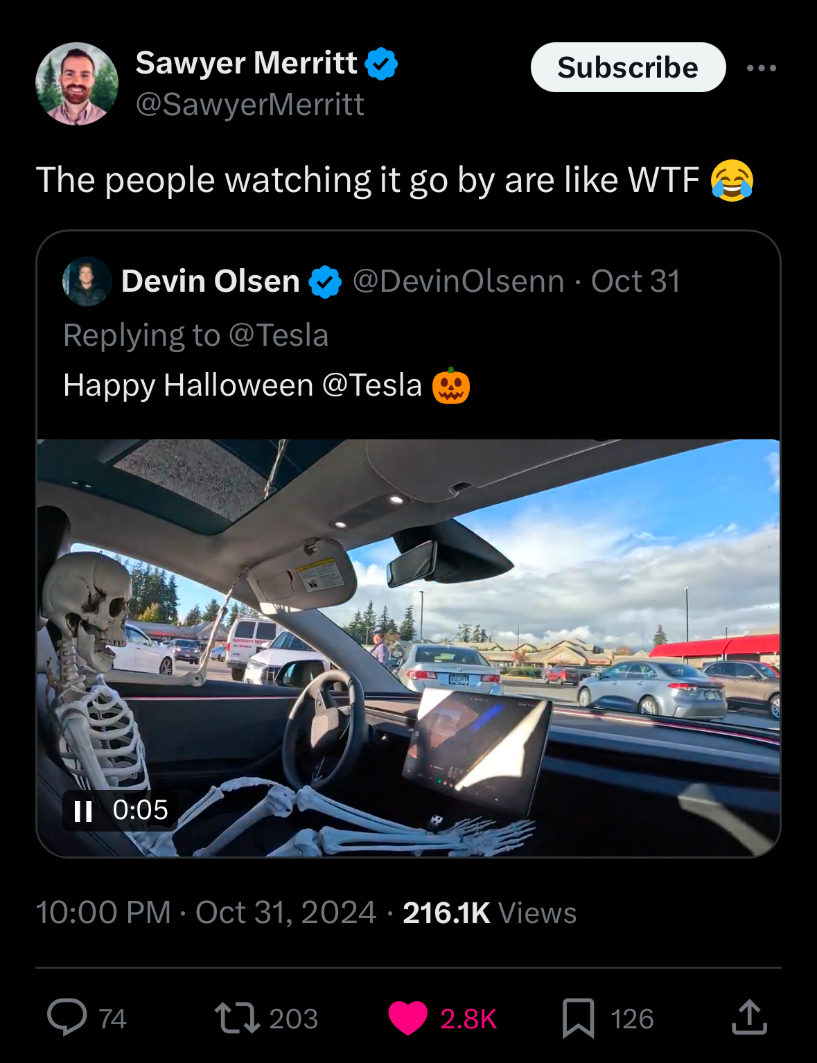 Will there be a fad to put a life-size plastic skeleton in the driver’s seat of a self-driving car, by 2030, such that of ten random Americans asked, most than half of them will say oh yeah I’ve seen that