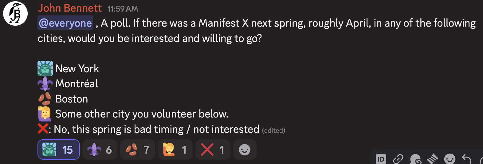 Question will resolve to which city or region hosts the next Manifest X event by the end of 2026. If there are none, "There is no other Manifest X by the end of 2026" will resolve yes.