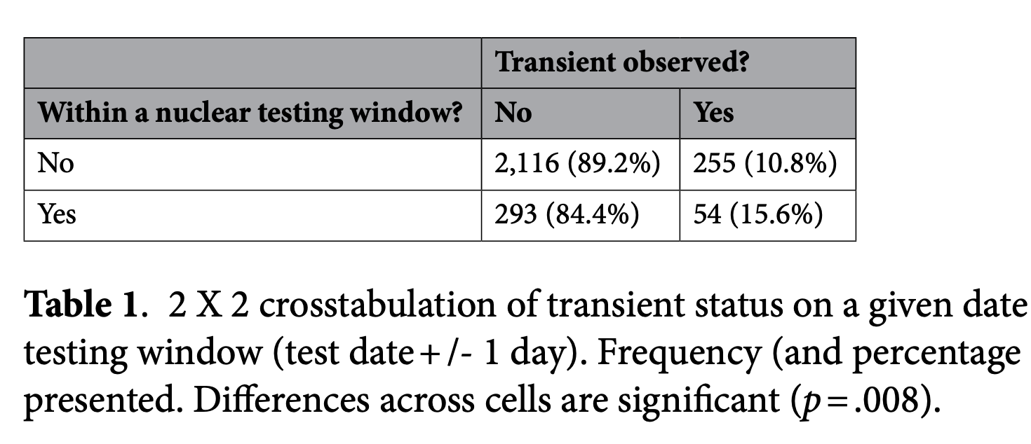 On top of that, the +/- 1 day thing strikes me as extremely suspicious. If the thesis is something like "nuclear testing triggers transient obsevations," then why the heck would that happen 1 day BEFORE a nuclear test? There are just too many research-degrees-of-freedom here.