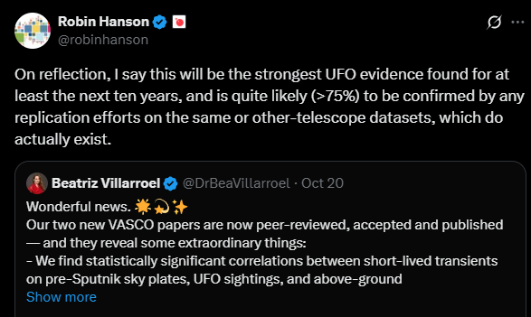 @bens The UAP hypothesis would have to include some sort of surveillance anticipating the test, which increases its komolgorov complexity (further from default occam). I think this paper is more of a hypothesis-generator than something conclusive. If it really does stand up to tougher scrutiny, (there are more tests to be done on this data) we then need hypotheses to explain the phenomenon.