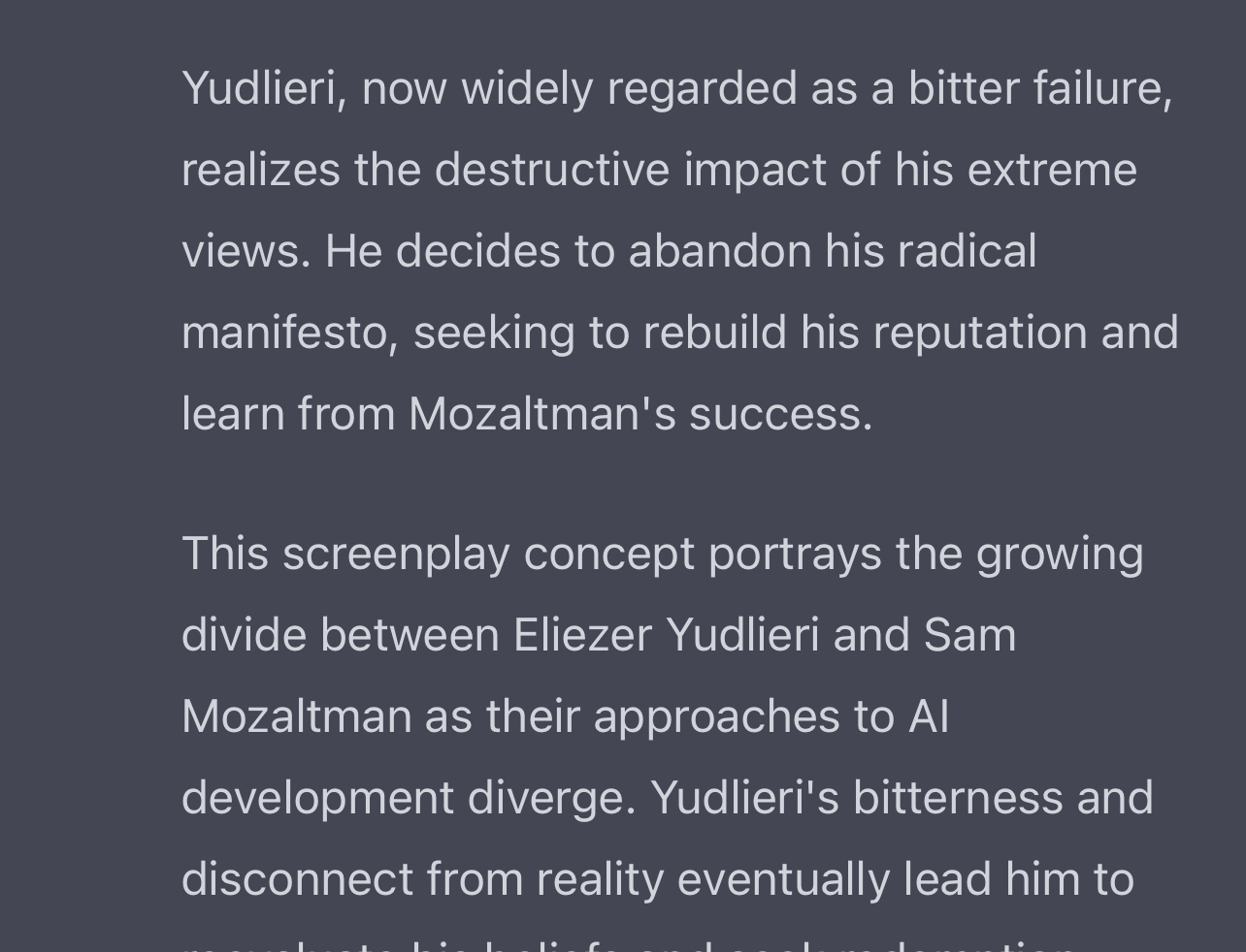 Yuddy succeeded in starting a doomsday cult and now his personal stock is rising in proportion to how worked-up he can get others on the question of AI safety. Funny all the talk about bad alignment of AIs, while no one questions the incentives Yuddy faces in perpetuating his doomerism. I suggest we start worrying about Yuddy safety; how many people will suffer and die as Yuddy chucks his wooden codpiece into the path of progress?