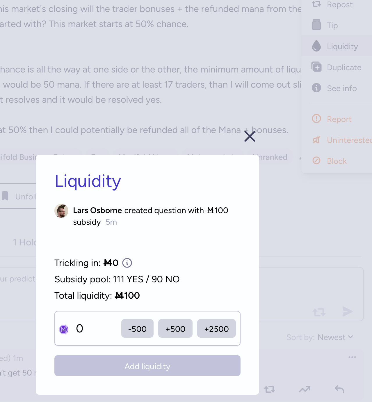 @LarsOsborne it’s complicated, open up the liquidity and it will show you though. Currently, at 1 trader and 45%, you’d get back 111 if you resolved it yes and 90 if you resolved no.