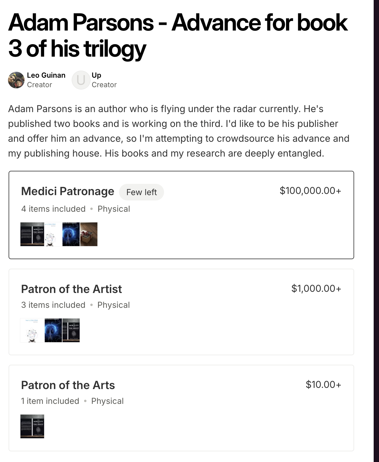 Adam Parsons is an author that I see as incredibly undervalued. So I'm crowdsourcing an advance as the first step in building my own publishing house.