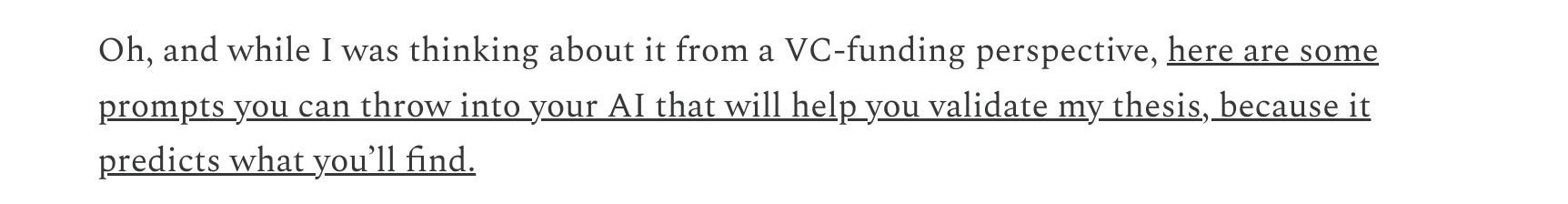 And in return, I'll just feed a marketing budget into the no here, in exchange for the validation work being done. And if you think I'm actually sane and not tilting at windmills for 5 years, you'll realize there's probably some alpha in something that tech isn't interested in hearing about how maybe they aren't really that valuable.If this doesn't work, my backup plan is to start trying to run my town's social media accounts as a bot farm to test how much I can fuck with the algorithms. And basically let the town work as a coherent unit on social media that ensures information travels in orderly ways that benefit the community. I offered to run my favorite coffee shop's social media accounts to see if I can start playing with this stuff locally. So we'll see. That might make for some fun prediction markets.