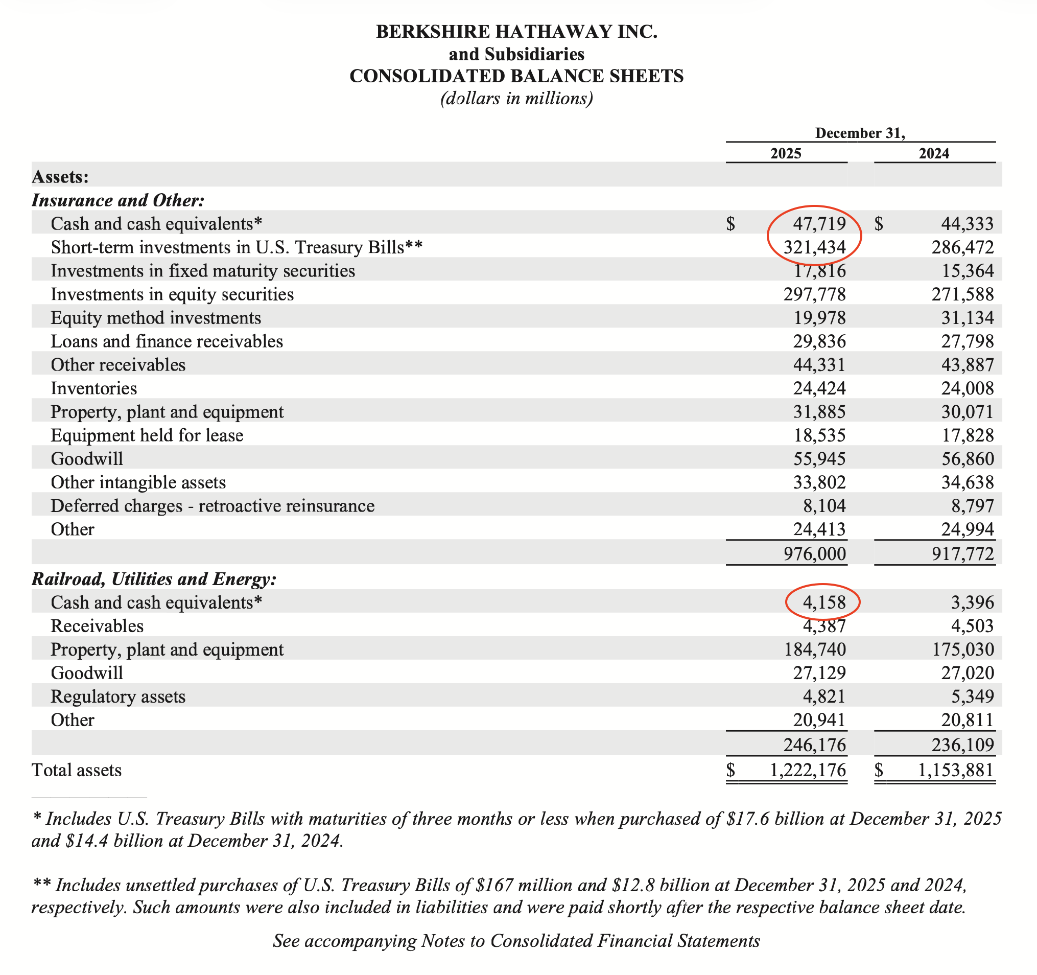 Cash and cash equivalents, as well as short-term investments in U.S. Treasury Bills, will be considered as cash. The reference point is the official shareholder report from Q3 2023, which indicates a total cash amount of $157,241 million. This question will round to the nearest million and the comparison will be made with the Q4 2025 report.