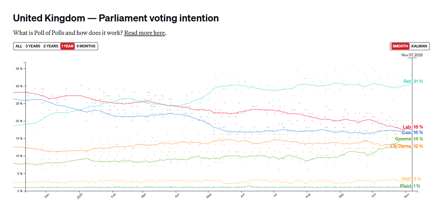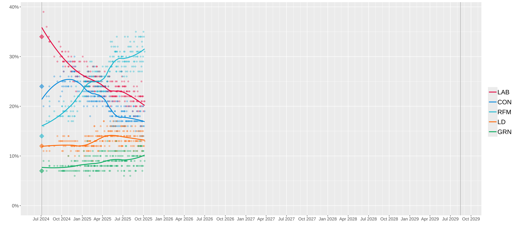 I think Reform are unlikely to ‘win’ as such due to the First-past-the-post (FPTP) voting system, which essentially means that an increase in the share of the popular vote doesn’t translate automatically into seats. Generally, FPTP means smaller parties like Reform are unlikely to gain enough seats to form a government even if they have a lot of votes. It is possible that they will go into coalition with the Conservatives and ‘win’ in that way, but I still wouldn’t rate this probability very highly: what I would say is more likely is that the Conservatives go further to the right in order to get Reform votes. I also think it’s possible that Nigel Farage is taken in by the Conservative Party.